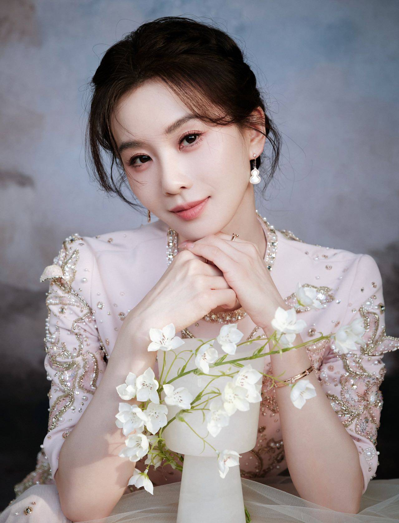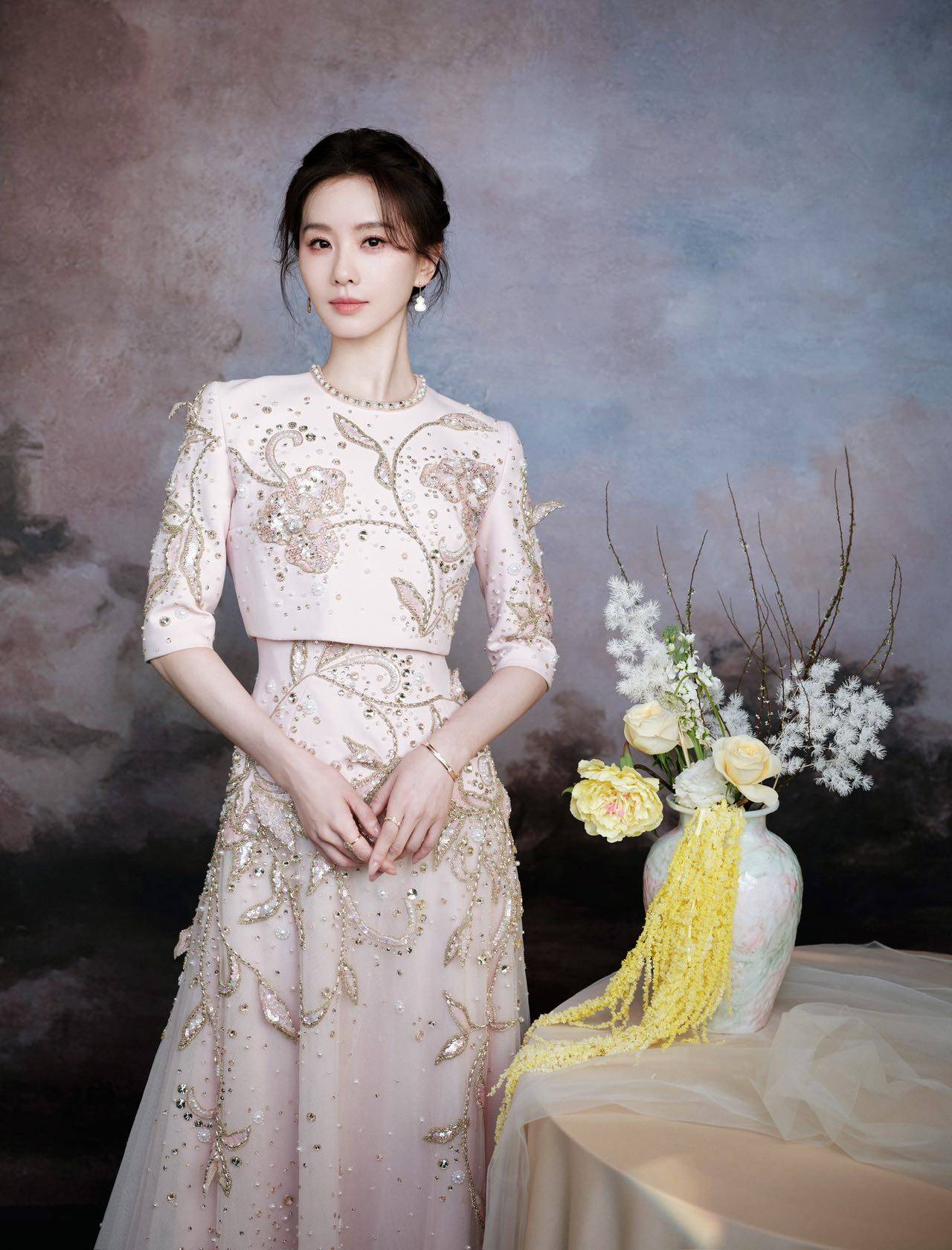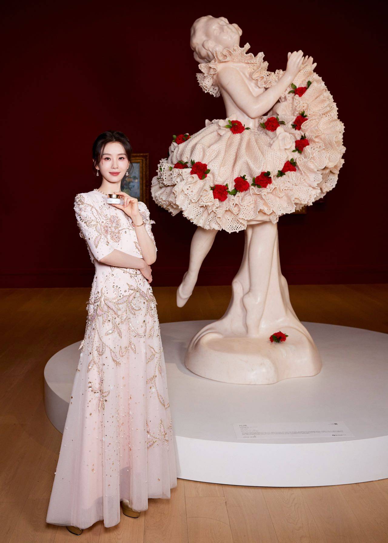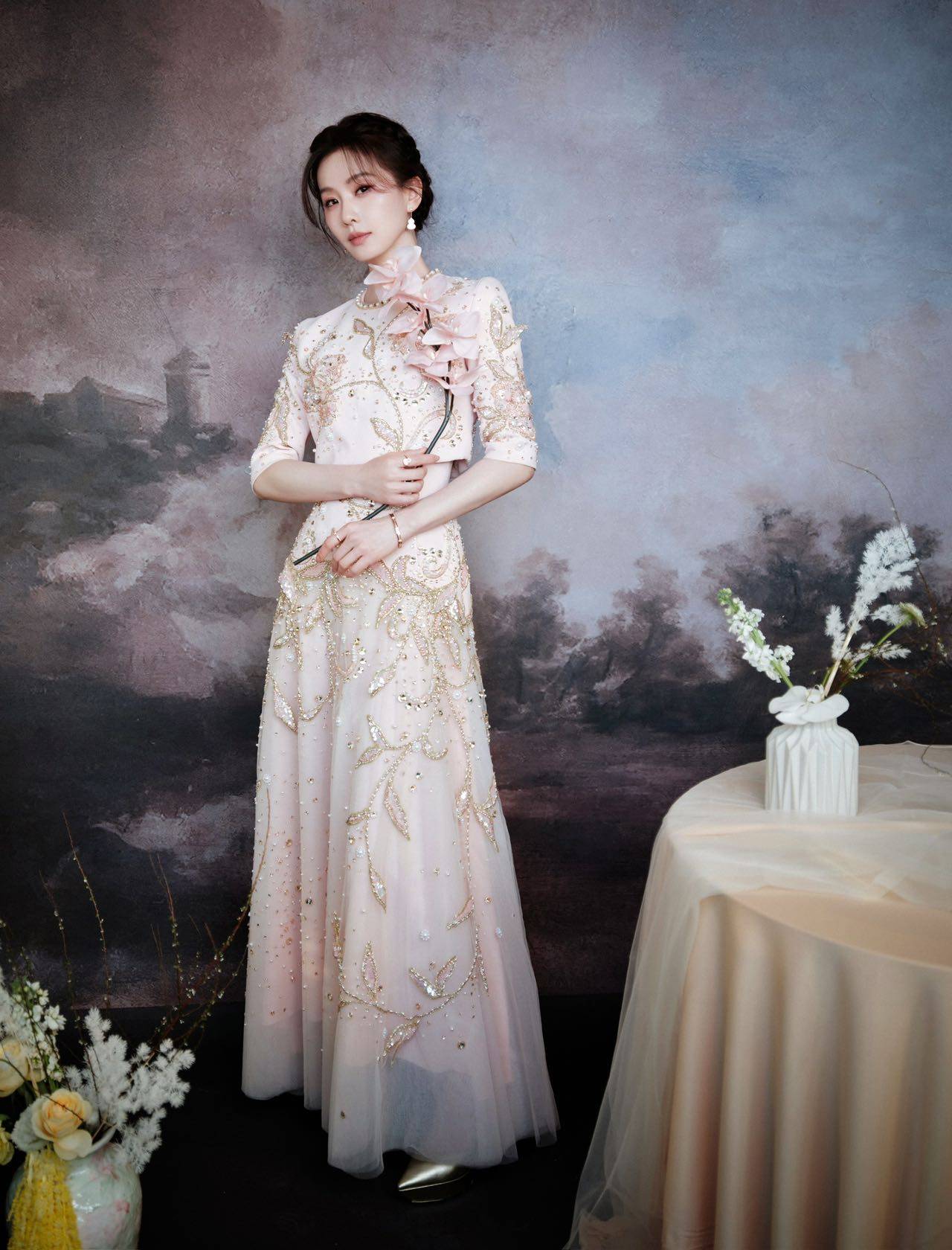 此次造型是东方美学与现代设计的完美融合。刘诗诗身着杏粉色重工刺绣高定礼服,裙摆垂坠如流水,珠钻点缀似碎月,腰间收口线条利落柔美,恰如白瓷瓶口弧度,与主题巧妙呼应。利落仙女盘发凸显修长脖颈与挺拔肩线,尽显芭蕾舞者优雅,举手投足宛如行走的温润白瓷。