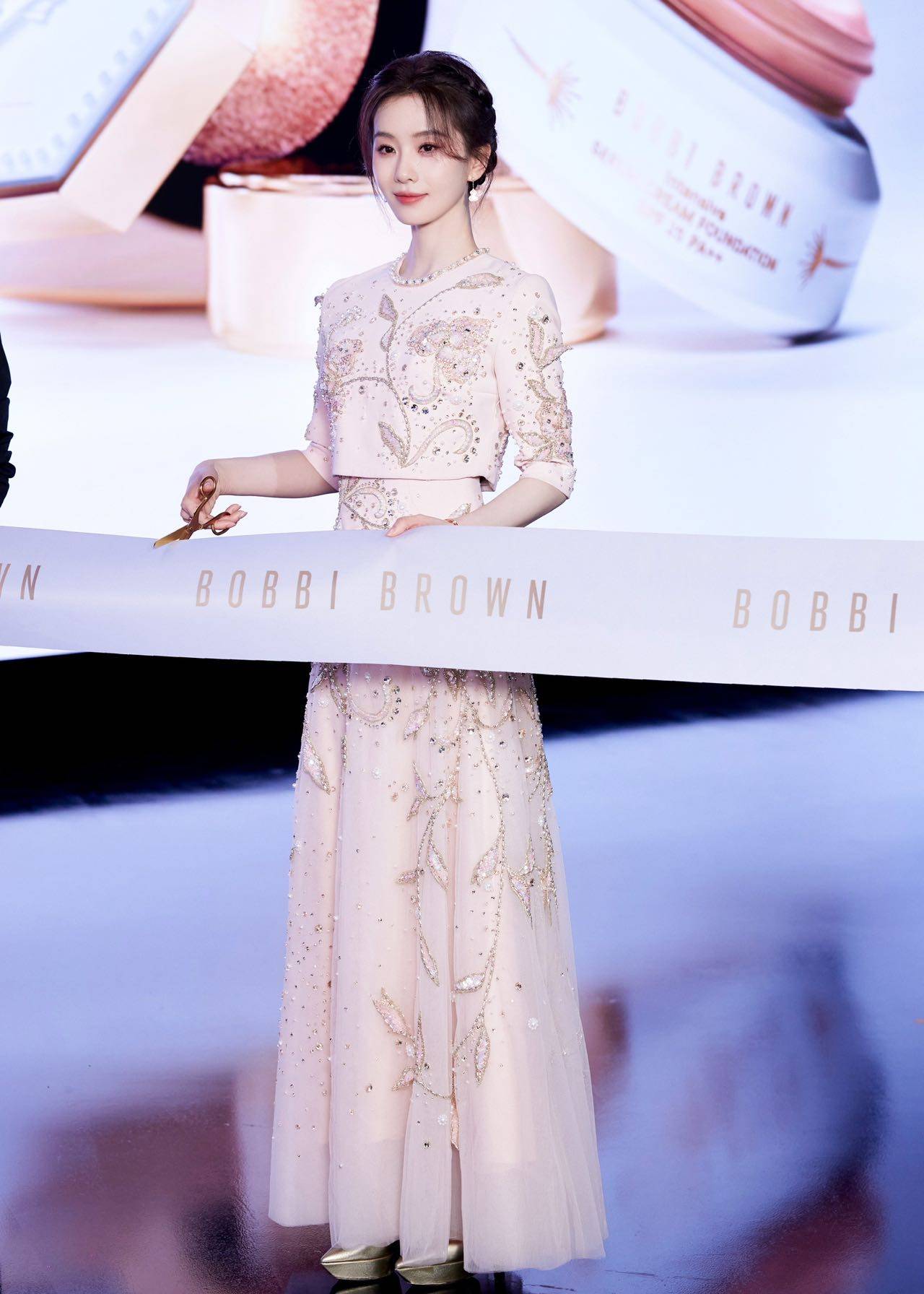 妆容堪称点睛之笔,以清透服帖为核心,肌肤如凝脂白瓷般细腻通透。浅粉蜜桃色眼妆弱化锋利线条,让眼眸清亮灵动;液体腮红从眼尾晕染至面中,与瓷白底妆形成冷暖撞色,既增温柔感又强化面部折叠度;浅杏色唇妆低调提气,将东方女性温婉雅致与千金贵气诠释极致。活动生图中,无滤镜镜头下的她肌肤细腻无瑕疵,妆容服帖,优越骨相与端正仪态尽显,真正做到“生图即精修”。