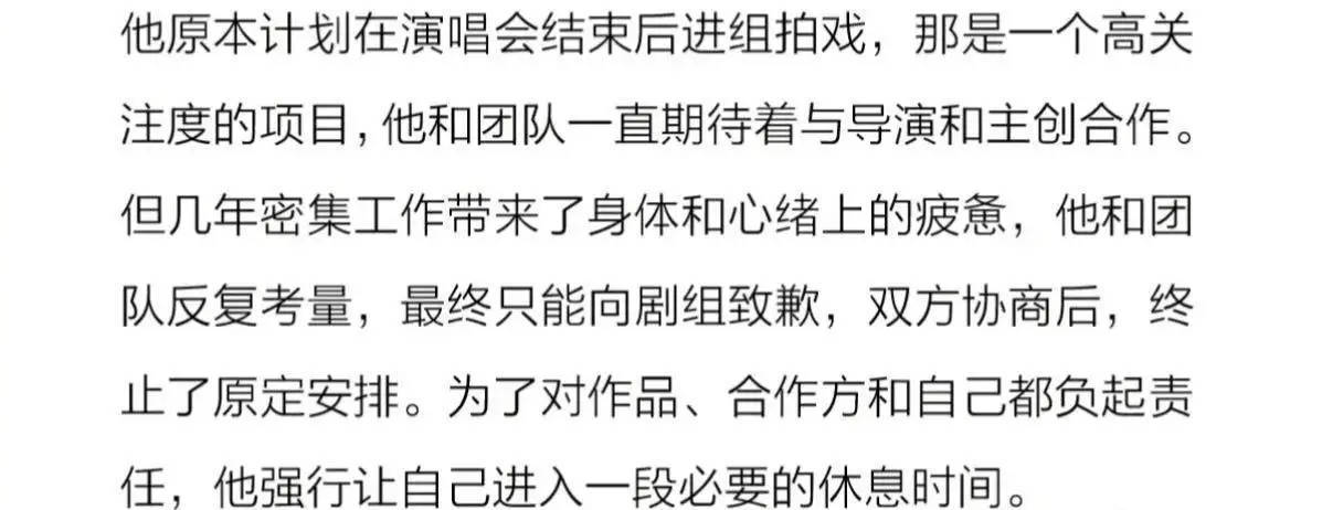 据易烊千玺透露,其原计划在演唱会结束后投入新剧拍摄,不过长期密集工作致使他身体和精神都极度疲惫。他和团队慎重考量后,向剧组致歉并敲定终止原定进组计划。