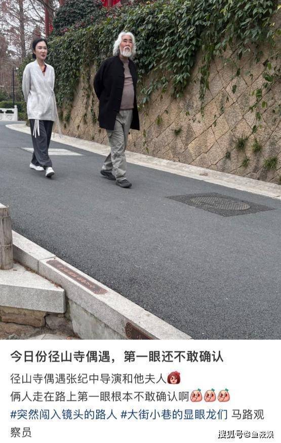 最近这不就有新瓜了嘛!12 月 10 号,有网友在径山寺偶遇了这对夫妻,俩人正慢悠悠地在寺庙里闲逛呢。咱先说说张纪中老爷子啊,之前网上还流传过他染黑发的照片,不少人还说 “老爷子不服老,染了发看着年轻不少”,结果这次偶遇照一出来,才知道那都是假的!张纪中还是一头标志性的白发,看着就特别有辨识度。74 岁的年纪,咱也不能要求人家跟小伙子似的身板硬朗了,照片里的他虽说不上老态龙钟,可那大腹便便的样子,是真真切切地透着老年态了,走路看着也慢悠悠的,估计是逛寺庙得沉下心来,不能太急躁。