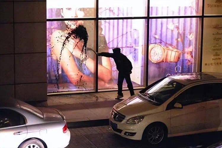 当时她的巨幅海报被不明身份者泼墨损毁,现场还伴随着辱骂声。