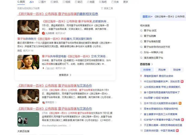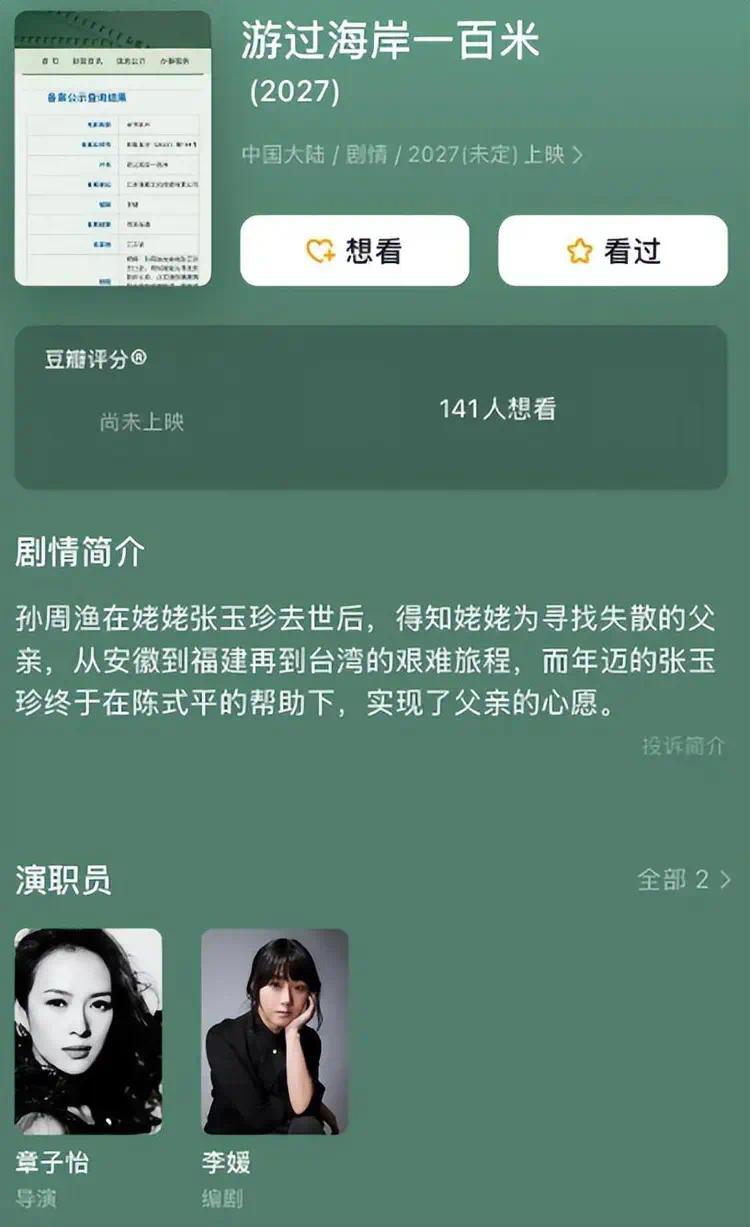今年7月1日,据@南都娱乐,网传章子怡将导演首部长片《游过海岸一百米》,豆瓣上也有相关信息。