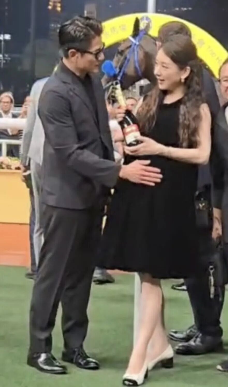 郭富城的爱驹“舞林宝典”在当日活动中胜出,郭富城一脸兴奋,与妻子相拥庆祝。在随后的拍照环节,郭富城还开心地轻抚着方媛的“孕肚”,似乎正在和小宝宝交流。