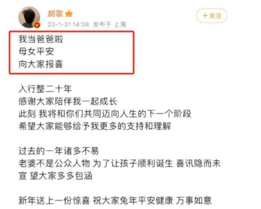 一开始大家都不知道两个人结婚这件事,还是胡歌在社交平台上官宣母女平安,大家才知道,原来胡歌已经结婚了。