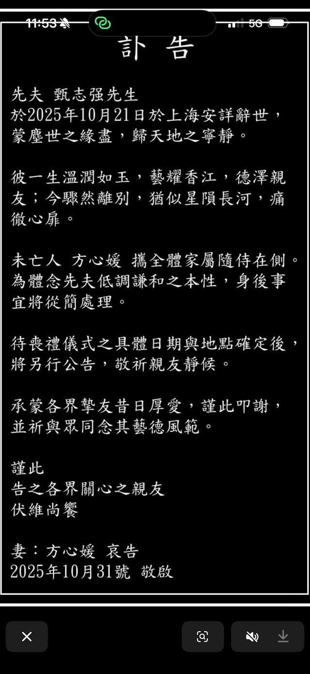 甄志強的太太方心媛发布噩耗,称甄志強于2025年10月21日在上海安详辞世,蒙尘世之缘尽,归天地之安宁,携全体家属随侍在侧,念及丈夫低调谦和的为人,身后事从简处理,丧礼日前将另行公布。