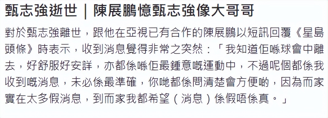 香港演员陈展鹏发声证实此事,表示甄志強是在球会去世的,很舒服很安详,两人是多年好朋友,他怀念这个热心的大哥哥,不过也说刚刚接收到消息,真假难辨,具体情况等待家人回应。