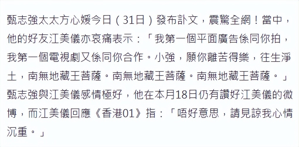 香港演员江美仪发文悼念,称第一次广告及电视剧都是和甄志強合作,愿他离苦得乐,受访表示心情沉痛,因为几天前才送别资深演员许绍雄。