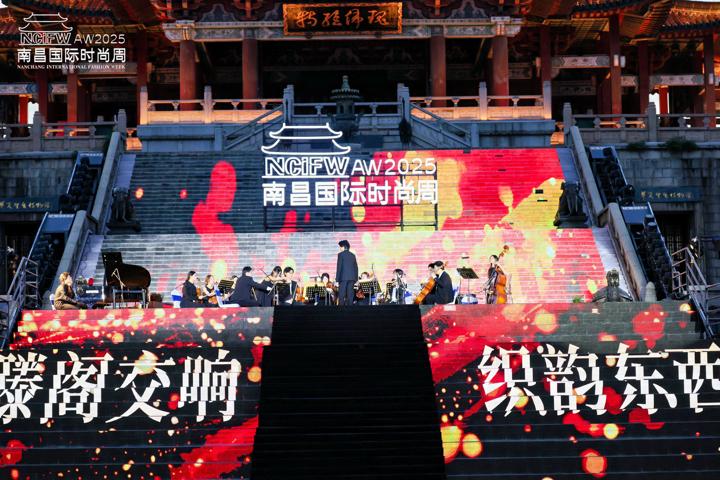 作为本届时尚周的核心板块,滕王阁主会场连续9场大秀11个高定和知名品牌上演视觉与文化的双重盛宴。清华大学教授、知名设计师李薇以“引赣鄱风·形天地衣”高定时装秀将鄱阳湖的粼粼波光与缥缈意境融入现代解构剪裁,呈现“一衣一景”的东方哲学;“滕阁交响・织韵东西” 史诗音乐秀也是备受好评,作为国内首次将西方古典交响乐走出传统舞台,在滕王阁这一历史古迹的实景户外空间,以一场别开生面的“时尚大秀”形式震撼上演,这是一场前所未有的视听盛宴。